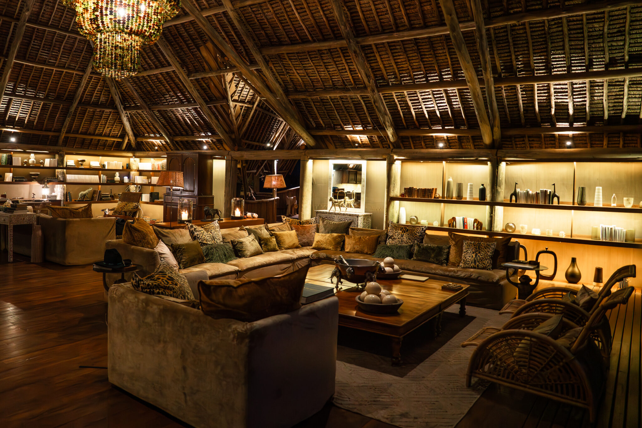 “The enormous chandelier designed by Julie is truly impressive. It is made of recycled glass beads by Shanga Design in Arusha, an organization that employs people with disabilities. The velvet sofas from Maison de Vacances welcome you voluptuously for a reading moment, gently lulled by the sounds of the wild nature…”