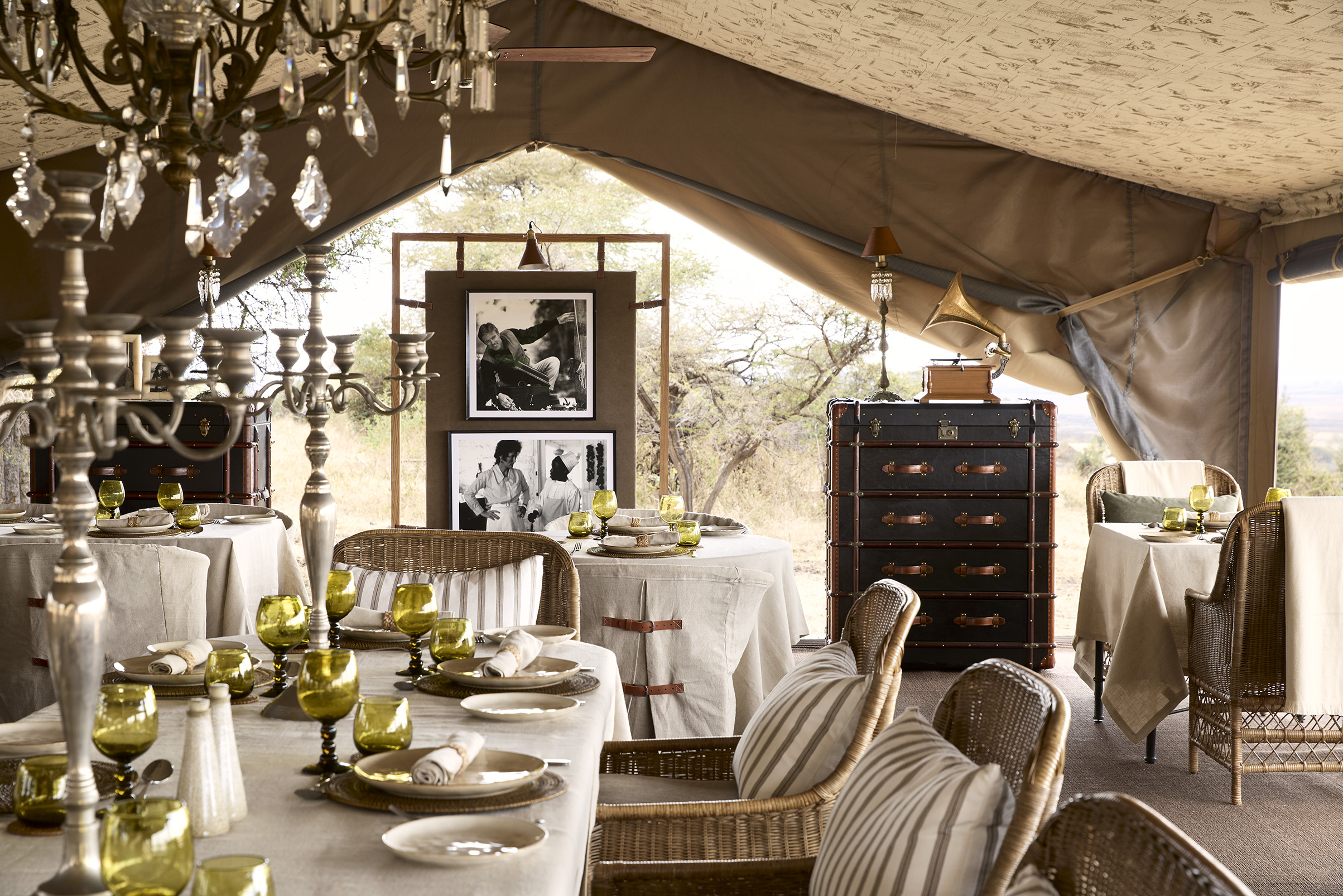 La décoration du camp affiche une atmosphère héritée d’un autre temps, évocateur des anciennes expéditions, qui associe esprit d’aventure et élégance aristocratique. Le cuir se mélange au cristal, rotin et vaisselle florale anglaise invitent au tea time, le grammophone